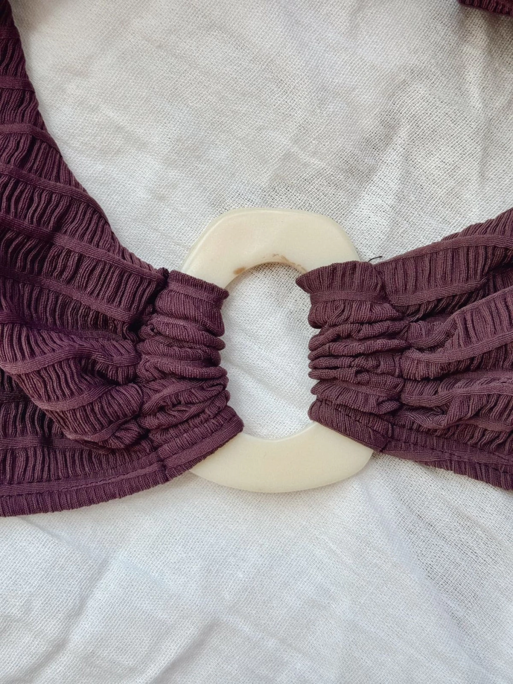 Conjunto top con argolla en el centro y tiras en espalda para atar con un nudo a tu medida. Bombacha vedetina cavada Esta confeccionada con lycra de textura de composicion 85% Poliamida y 15% Elastano.
