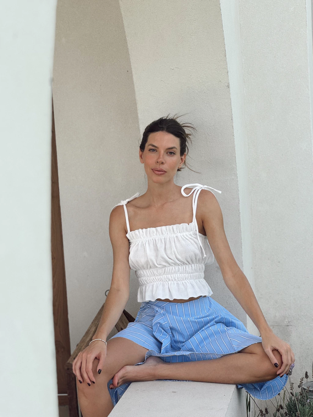 Musculosa strapless fruncida con tiritas en hombros para atar.