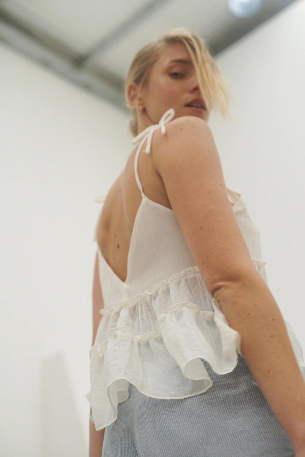 Blusa con escote en V, breteles regulables para atar e ingreso a la prenda con tirantes en la parte delantera. Confeccionada en una gasa rústica de composición 100% Polyester. Ideal para romantizar todos tus looks.